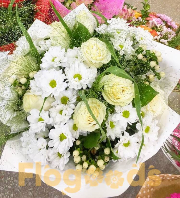 Букет "Белый Ангел" - отличный летний букет. В нем мы используем белые розы сорта "Аква" 60 см, а так же свежие хризантемные ромашки.